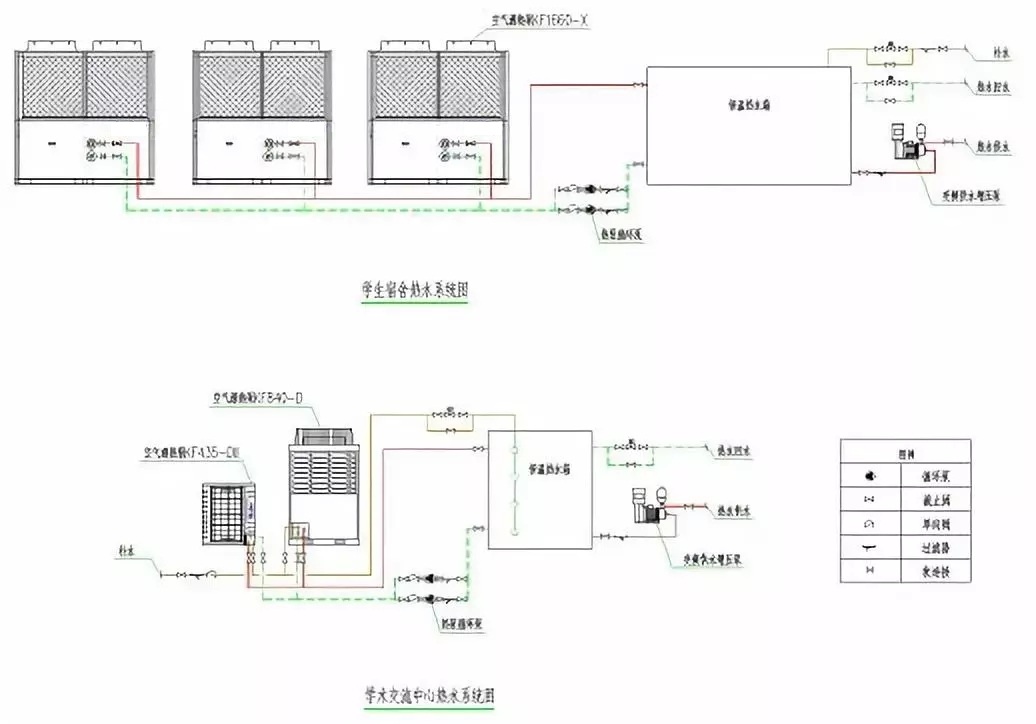 本項(xiàng)目為福建省某中學(xué)洗浴熱水項(xiàng)目,共有2個(gè)熱水需求點(diǎn):宿舍樓一棟共129間宿舍,學(xué)術(shù)交流中心一棟共80間客房,共配置3臺20匹循環(huán)式空氣源熱泵熱水器,10匹和5匹直熱式空氣源熱水器各1臺。