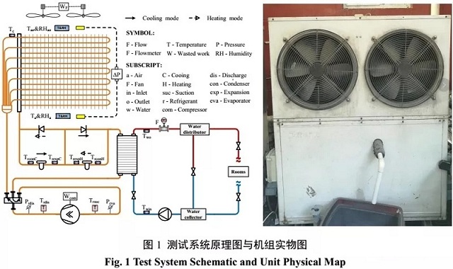測試系統(tǒng)對空氣源熱泵的空氣側(cè)、制冷劑側(cè)與制取熱水側(cè)的運行參數(shù)以及能耗情況進行實時監(jiān)測。測試機組原理圖與實物圖如圖1中所示,在壓縮機吸/排氣管上分別設有溫度和壓力傳感器監(jiān)測壓縮機的吸/排氣溫度和壓力,在水側(cè)利用鉑電阻PT1000測量機組的進/出水溫度,利用電磁流量計測量水流量。其中主要的測量儀器參數(shù)如表1所示。