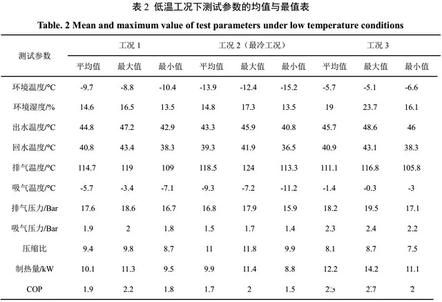 由表2可知,三個工況平均制熱量分別為:工況1為10.1kW,工況2為9.9kW,工況3為12.5kW,相對于額定制熱量19.6kW,機組制熱量的衰減幅度分別為48.5%、49.5%和36.2%,三個工況整體的平均制熱量10.7kW;經(jīng)統(tǒng)計,三個工況總能耗量為167.4kWh;三個工況平均COP分別為:工況1為1.91,工況2為1.71,工況3為2.25,整體COP均值為1.96。其中,最冷工況下,當溫度低至-15.2℃時,制熱量僅為8.8kW,衰減幅度高達到55%,COP僅為1.49。因此,低溫導致了機組的制熱量和COP嚴重衰減。