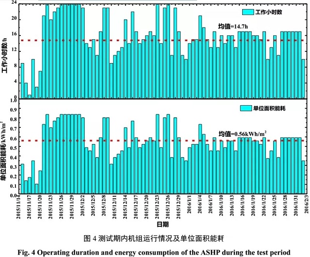 圖4為測試期內(nèi)空氣源熱泵每天的運行時間和單位面積能耗。