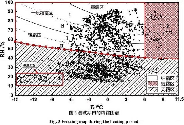 由圖可知,隨著供暖期的推進,環(huán)境溫度呈下降趨勢,在2016年1月23日達到最低溫度;相對濕度變化幅度較大,測試中后期,環(huán)境相對濕度較低,北京氣候呈現(xiàn)“干冷”的特點。為直觀獲得測試期內(nèi)機組不同運行工況下的結(jié)霜和結(jié)露情況,根據(jù)朱佳鶴[23,24]等人提出的多區(qū)域結(jié)霜圖譜,得出如圖3所示的結(jié)霜工況分布圖。