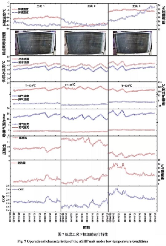在測試期內(nèi),受強寒潮影響,北京地區(qū)2016年1月22日~2016年1月24日處于持續(xù)低溫黃色寒潮預警中,三天內(nèi)環(huán)境溫度在-15.2~-5.1℃范圍內(nèi)波動,平均溫度為-10.5℃。為分析熱泵系統(tǒng)在此低溫工況下的運行性能,選取三個低溫工況,每個工況連續(xù)運行9小時,依次從低溫工況,低溫運行特性和低溫供熱性能三個方面進行描述。表2為測試參數(shù)的詳細數(shù)值表,圖7為低溫期間空氣源熱泵各個工況的運行結(jié)果。