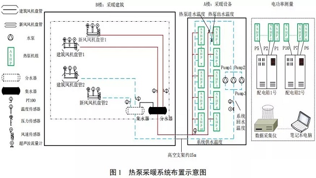 如圖1所示,由于醫(yī)院樓房改造等因素,熱泵機組及其附屬設備置于A樓樓頂,距離采暖建筑B樓約15m,兩者之間由供回水管連接?諝庠礋岜貌膳到y(tǒng)布置如圖1所示,采暖熱水至采暖建筑B樓分為2路,分別為建筑供暖和新風供暖。
