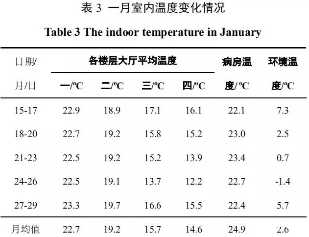 如下表3所示,室外平均干球溫度2.64℃,一/二/三/四樓大廳月平均溫度分別為22.7℃、19.2℃、15.7℃和14.6℃。其中,高樓層大廳用戶窗常開,導致三/四樓大廳室內溫度偏低。各樓層病房月平均溫度為:24.9℃。病房人員日間習慣窗戶微開,保持室內空氣流通,故日間室內溫度存在小范圍波動,室內溫度基本不低于20℃。