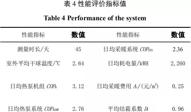 對各采集數(shù)據綜合分析,整個冬季采暖測試時間:2016年1月19日~3月4日,共45天。總體性能指標如下表4所示,采暖周期內平均結霜系數(shù)為0.96。其中,共有四天結霜天氣(分別為:1月28日、1月29日、1月31日和2月1日)在換熱器翅片表面有結霜,結霜系數(shù)分別為0.96、0.94、0.97和0.98。
