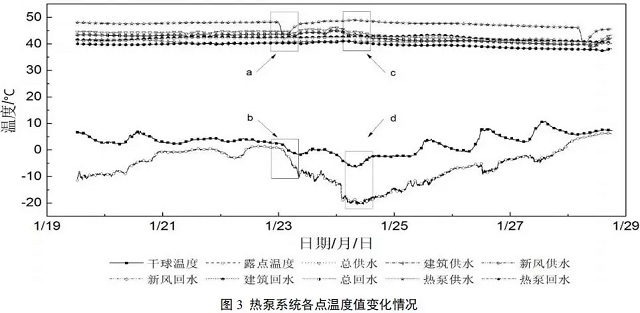 如圖3中c區(qū)域所示,出現(xiàn)測量周期內最冷天氣,日平均溫度為-6.90℃,單臺熱泵供水溫度均值48.6℃,系統(tǒng)總供/回水建筑、新風供水、單臺熱泵供/回水溫度均出現(xiàn)下降,而建筑回水和新風回水溫度基本不變,其日均值分別是42.6℃和41.5℃。