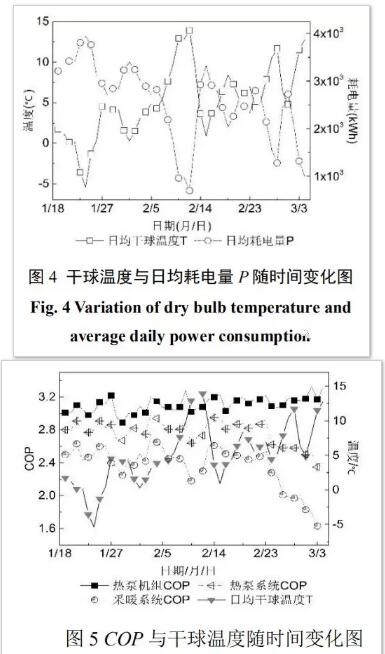如圖4所示,日均耗電量P與干球溫度呈反比關系趨勢,測試采暖周期內日均耗電量2,260kWH。