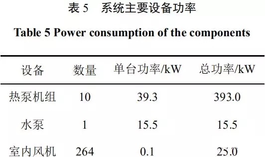 系統(tǒng)主要設備功率如表5所示,單臺熱泵機組功率為39.3kW;單臺水泵功率為15.5kW;室內風機共264臺,風機總功率為25kW。由于室外干球溫度升高,室內供暖需求減少,熱泵機組運行數(shù)量減少,使得采暖水泵和室內風機等占主要運行能耗。系統(tǒng)能效變化原因分析有以下2點: