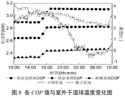如圖8所示,結霜工況下(29日10:00-16:30),系統(tǒng)進入間歇啟停模式,熱泵機組COPH下降,均值為2.89。當系統(tǒng)結束化霜進入普通模式后(29日18:00-30日11:00),各COP值上升,系統(tǒng)開始正常運行。