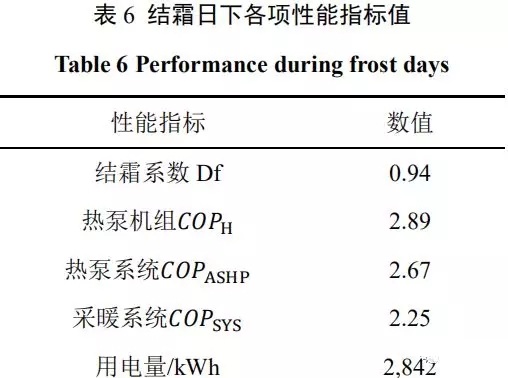 本文選取典型結霜日(1月29日10:00~1月30日11:00),對熱泵機組在結霜環(huán)境下工況做進一步分析。結霜工況下各項性能指標平均值如表6所示: