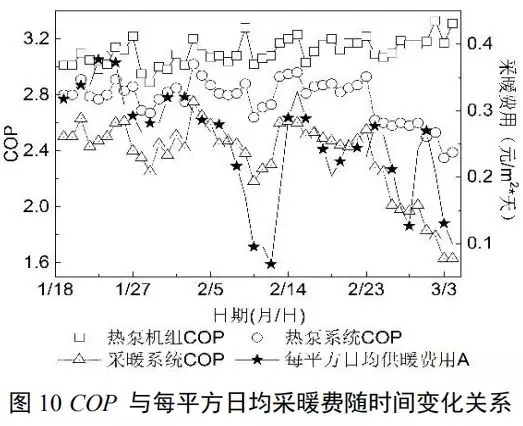 如圖5所示,呈現(xiàn)系統(tǒng)性能指標與室外干球溫度的變化關系。其中,日均熱泵機組COPH:3.12;日均熱泵系統(tǒng)COPASHP:2.76;日均采暖系統(tǒng)COPSYS:2.36。