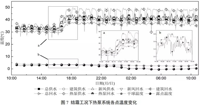觀察圖7中a和b區(qū)域,16:24時,空氣濕度降低,此時總供水溫度為31.3℃;16:54時,熱泵系統(tǒng)總供水溫度首次達到40.3℃;17:36時,回水溫達到40.2℃,表明熱泵系統(tǒng)開始穩(wěn)定運行,此時環(huán)境溫度3.41℃,露點溫度0.12℃。熱泵系統(tǒng)在結霜時,可保持總供水溫度保持在33.0℃附近,但達不到設定值要求溫度(44.0℃)。