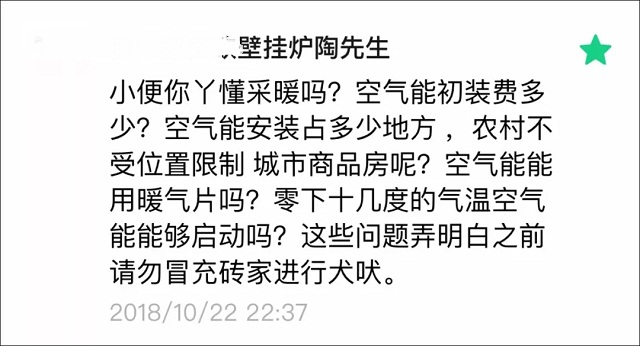 昨天發(fā)了一篇計(jì)算熱泵采暖費(fèi)用的文章,一個做壁掛爐的大哥不高興了,出口成臟:“小便你丫懂采暖嗎?空氣能初裝費(fèi)多少?空氣能安裝占多少地方?農(nóng)村不受位置限制城市商品房昵?空氣能能用暖氣片嗎?零下十幾度的氣溫空氣能能夠啟動嗎?這些問題弄明白之前請勿冒充磚家進(jìn)行犬吠!彪m然說,競品之間攻擊很正常,但是他問的問題挺有意思的,想必大家在銷售中也經(jīng)常遇到,所以我們索性公開解答一下,以正視聽。