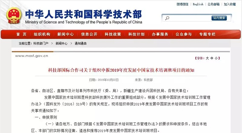 2018年9月30日,科技部國際合作司印發(fā)了《關(guān)于組織申報(bào)2019年度發(fā)展中國家技術(shù)培訓(xùn)班項(xiàng)目的通知》,指出申報(bào)重點(diǎn)技術(shù)領(lǐng)域:2019年度發(fā)展中國家技術(shù)培訓(xùn)班項(xiàng)目擬以成熟適用技術(shù)為主體,兼顧高新技術(shù)、科技政策與管理三類項(xiàng)目進(jìn)行支持。申報(bào)領(lǐng)域以農(nóng)林業(yè)、新能源與可再生能源、加工制造等領(lǐng)域?yàn)橹攸c(diǎn)。