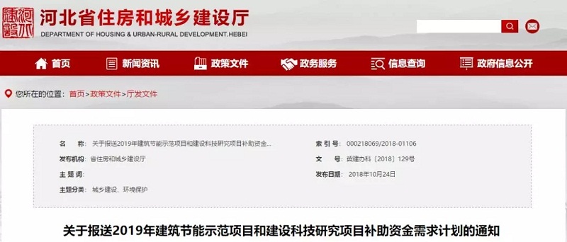 2018年10月24日,河北省住房城鄉(xiāng)建設(shè)廳辦公室印發(fā)《關(guān)于報(bào)送2019年建筑節(jié)能示范項(xiàng)目和建設(shè)科技研究項(xiàng)目補(bǔ)助資金需求計(jì)劃的通知》,指出在建筑節(jié)能示范項(xiàng)目方面,2019年省級建筑節(jié)能專項(xiàng)資金補(bǔ)助項(xiàng)目,原則上暫按《河北省建筑節(jié)能資金管理暫行辦法》(冀財(cái)建﹝2015﹞88號)、《關(guān)于省級建筑節(jié)能專項(xiàng)資金使用有關(guān)問題的通知》(冀建科﹝2017﹞34號)申報(bào)。其中二星級綠色建筑運(yùn)行標(biāo)識項(xiàng)目、可再生能源建筑應(yīng)用示范項(xiàng)目(空氣源熱泵項(xiàng)目)。