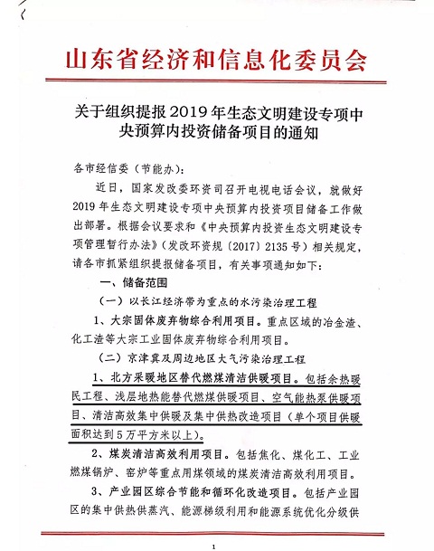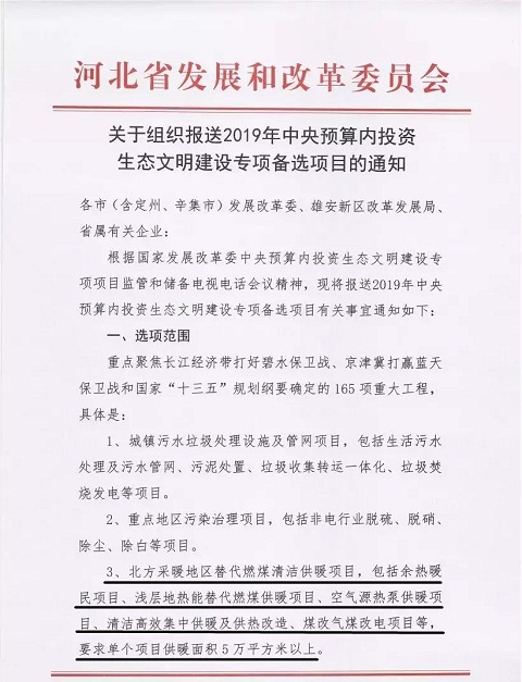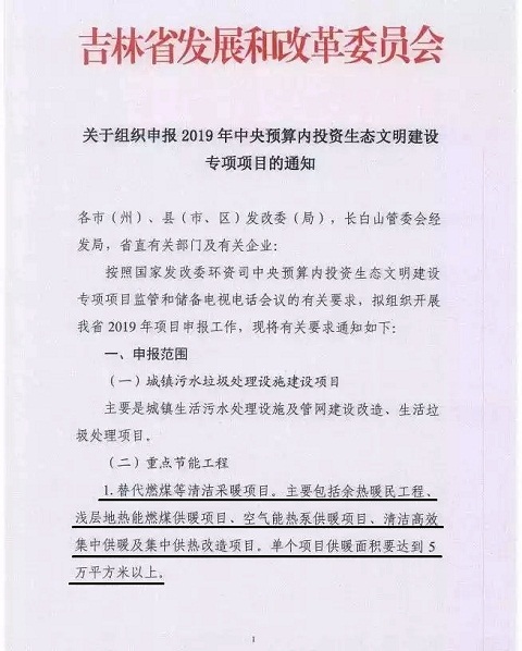 2018年7月31日,河南省發(fā)展和改革委員會印發(fā)《關(guān)于組織申報(bào)2019年中央預(yù)算內(nèi)投資生態(tài)文明建設(shè)專項(xiàng)備選項(xiàng)目的通知》,指出專項(xiàng)備選重點(diǎn)為北方采暖地區(qū)替代燃煤清潔供暖項(xiàng)目,主要包括余熱暖民工程、淺層地?zé)崮芴娲济汗┡?xiàng)目,空氣源熱泵供暖項(xiàng)目,清潔高效集中供暖及集中供熱改造項(xiàng)目,單個項(xiàng)目的供暖面積要達(dá)到5萬平方米以上。