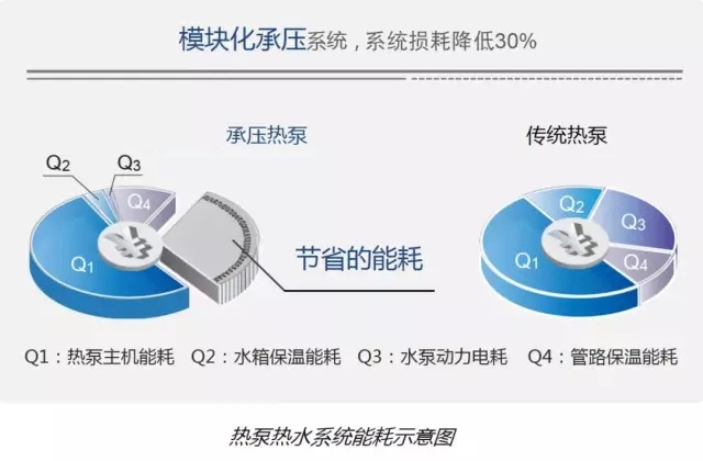 模塊化承壓熱泵系統(tǒng)與普通開式熱泵系統(tǒng)相比,在系統(tǒng)輸送環(huán)節(jié),還可極大程度地降低系統(tǒng)中水箱散熱損失、水泵的動力電能消耗等,從而大幅節(jié)省運營成本。