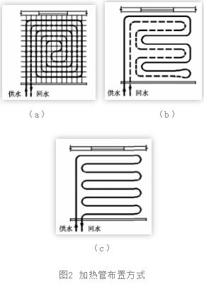 選用末端設(shè)備時(shí)應(yīng)考慮房間功能、生活習(xí)慣和運(yùn)行方式,從舒適性和經(jīng)濟(jì)性方面考慮,選擇適合住戶需求的地板輻射供暖、風(fēng)機(jī)盤管供暖、散熱器供暖形式。新建與既有建筑增設(shè)供暖設(shè)施要加以區(qū)別:新建住宅可完全按設(shè)計(jì)規(guī)范規(guī)定進(jìn)行,而既有建筑增設(shè)供暖設(shè)施要考慮住戶的具體要求,可進(jìn)行局部主要房間加裝供暖設(shè)施。既有建筑增設(shè)地板輻射供暖時(shí)應(yīng)考慮荷載,盡量采用干式地板供暖,并考慮局部供暖和家具擺放遮擋。地面飾面層應(yīng)采用熱阻小的材料。各環(huán)路長(zhǎng)度應(yīng)盡可能一致,并加設(shè)調(diào)節(jié)和環(huán)路關(guān)斷閥門。加熱管布置方式可采用圖2的形式。