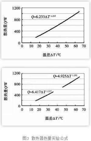 風(fēng)機(jī)盤管冷暖兩用,供水溫度可降低,用于住宅供暖時(shí)宜立式安裝,宜靠外窗設(shè)置。散熱器用于空氣源熱泵供暖系統(tǒng),熱媒溫度可降低與熱水供應(yīng)溫度55℃一致。其散熱量計(jì)算完全可按各類散熱器給出的實(shí)驗(yàn)公式,代入ΔT℃進(jìn)行計(jì)算即可。圖3是對(duì)同一組散熱器分別對(duì)溫差ΔT=15℃~65℃進(jìn)行分段實(shí)驗(yàn)和連續(xù)實(shí)驗(yàn)的結(jié)果,低溫工況的散熱量可視為ΔT=40℃~65℃試驗(yàn)曲線的延長(zhǎng)線。