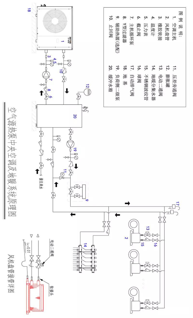 摘要:本文詳細介紹了空氣源熱泵二聯(lián)供產(chǎn)品在江西該別墅項目中央空調和地暖系統(tǒng)中的應用。比較了我國目前常規(guī)戶式中央空調和采暖系統(tǒng)冷熱源設備的選擇方案及其各自的優(yōu)勢和劣勢,提出了適用于夏熱冬冷地區(qū)別墅、住宅類項目最經(jīng)濟、合理的獨立中央空調系統(tǒng)配置方案,給出空氣源熱泵在其適用設計工況下機組、末端的容量配比建議,并詳細闡述了空調水管路系統(tǒng)各部件的設計關鍵點和后期的使用建議。