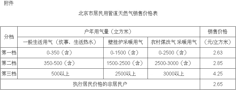 據(jù)北京市發(fā)改委,經(jīng)過(guò)調(diào)整后,居民用氣價(jià)格具體為:第一檔為每立方米2.63元,第二檔為2.85元,第三檔為4.25元。