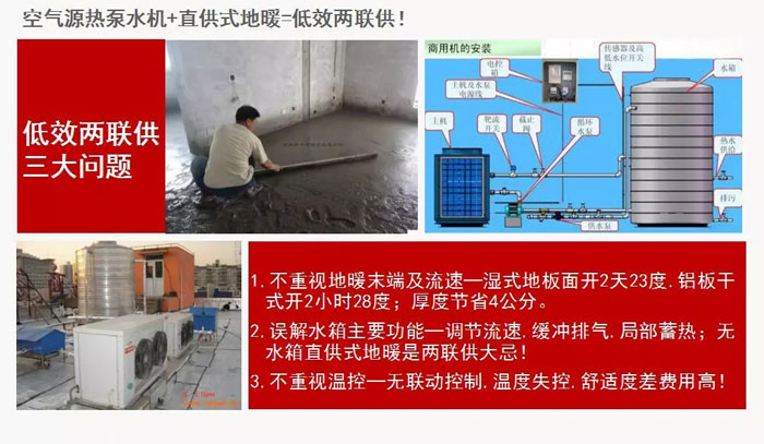 1、空氣源熱泵+(水箱+普通溫控+干式地暖高效末端)=高效兩聯(lián)供