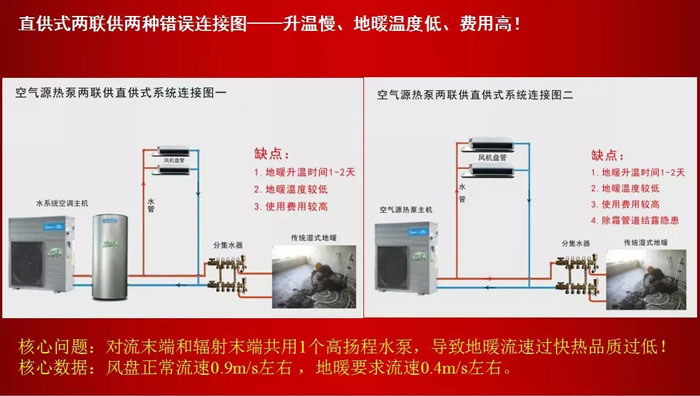 首先,空氣源高效兩聯(lián)供和低效兩聯(lián)供的主要區(qū)別是什么?經(jīng)差異化實驗對比,主要區(qū)別在于地暖末端結(jié)構(gòu)和連接方式。因為大家也清楚低效兩聯(lián)供就是空氣源熱泵水機(jī)+直供式地暖,所以容易出現(xiàn)問題的地方就是配置的地暖末端系統(tǒng)!