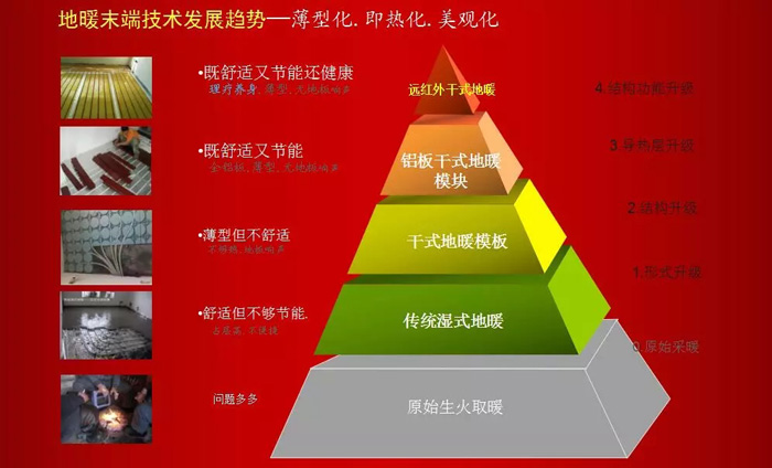 上圖是我做的一個地暖末端在技術(shù)上的發(fā)展趨勢:薄型化——即熱化——美觀化,這個大家可以看圖了解一下,具體我就不作解說了。