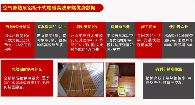 其中,系統(tǒng)標(biāo)配:1)全鋁板干式地暖模塊;2)分水器;3)DN13地暖管;4)專用接頭。這里我做了一個空氣源熱泵鋁板干式地暖高效末端優(yōu)勢數(shù)據(jù)圖,這個很寶貴,具體優(yōu)勢大家可以看下圖: