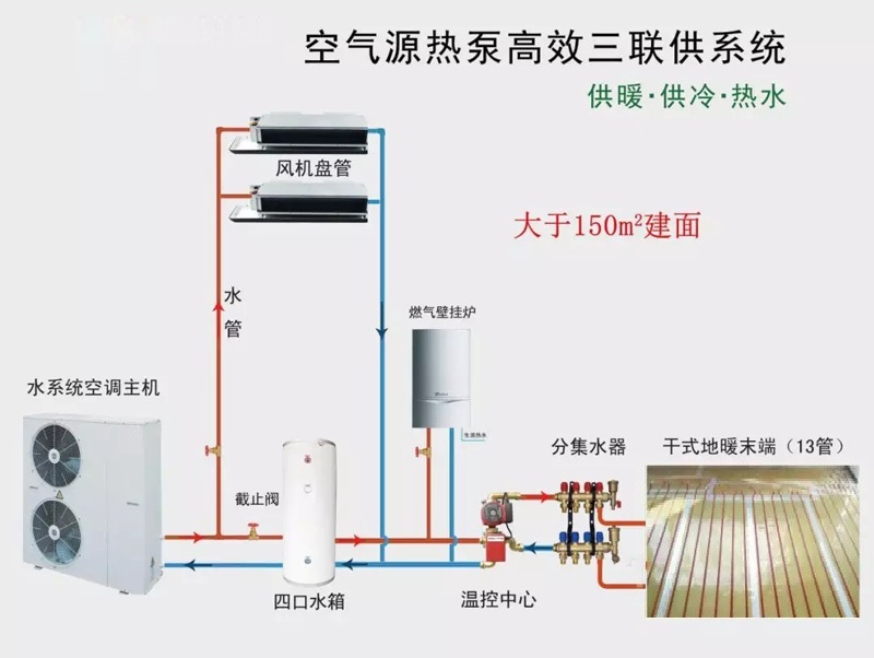 2)空氣源水系統(tǒng)+高效水地暖末端系統(tǒng)(臥室快裝電地暖)+壁掛爐,空調(diào)地暖熱水三聯(lián)供方案最優(yōu)!