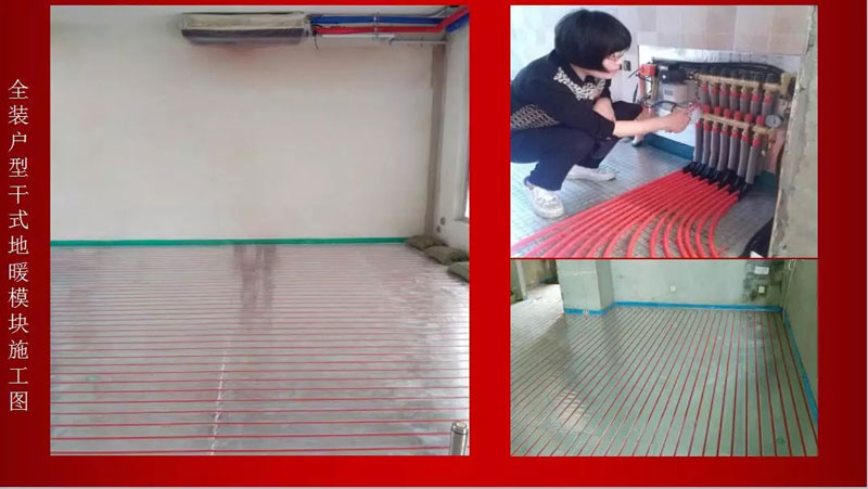 混裝戶型采用二次分水器、局部保護(hù)、水電聯(lián)動、地磚后貼四種過管工藝。地磚區(qū)模塊在貼磚前鋪設(shè),可與主管道一并施工;地板區(qū)模塊在鋪地板前鋪設(shè),與主機(jī)一并施工;不用水泥回填干式地暖施工配合相對更簡單!