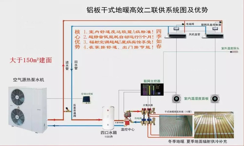 2、空氣源熱泵+(水箱+冷暖溫控中心+干式地暖高效末端)=高效二聯(lián)供