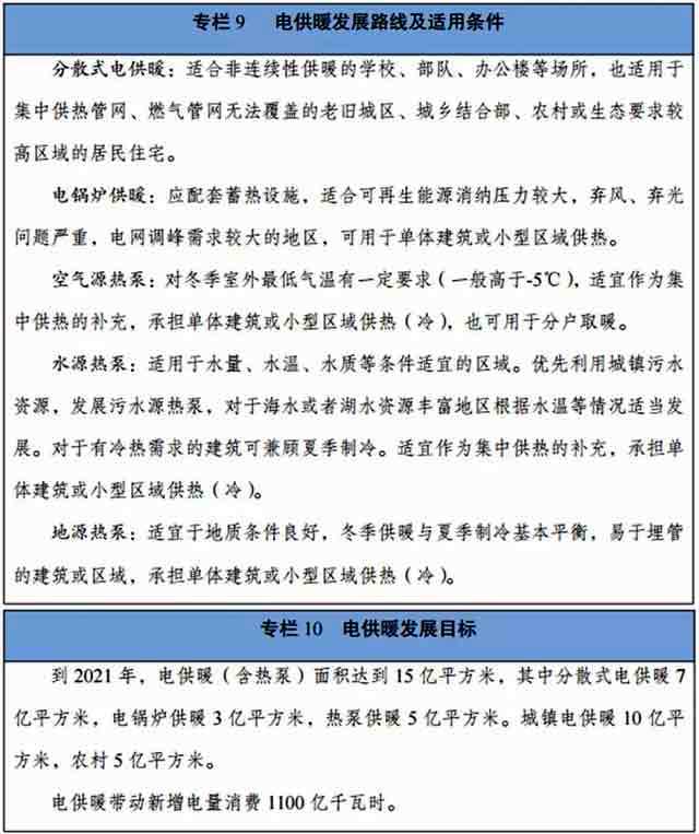 根據(jù)2017年12月5日,國家發(fā)展改革委等十部門聯(lián)合印發(fā)的《北方地區(qū)冬季清潔取暖規(guī)劃(2017-2021年)》,明確指出電供暖是利用電力,使用電鍋爐等集中式供暖設(shè)施或分散式電供暖設(shè)施,以及各類電驅(qū)動熱泵,向用戶供暖的方式,布置和運(yùn)行方式靈活,有利于提高電能占終端能源消費的比重。結(jié)合采暖區(qū)域的熱負(fù)荷特性、環(huán)保生態(tài)要求、電力資源、電網(wǎng)支撐能力等因素,因地制宜發(fā)展電供暖。
