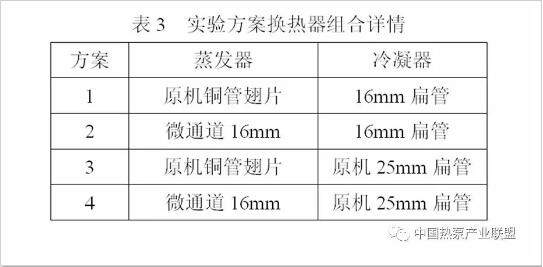 本文為了更好的評價(jià)替代方案的蒸發(fā)器和冷凝器的性能,進(jìn)行了四組不同換熱器組合的實(shí)驗(yàn),詳細(xì)的實(shí)驗(yàn)方案如表3所示。