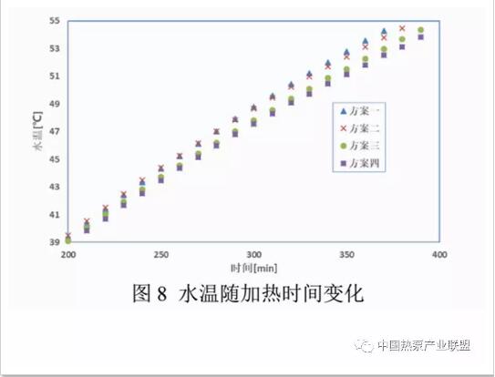 四種方案均是在環(huán)境溫度20/15的標(biāo)況下,將水從15℃加熱到55℃時(shí)停止測試。