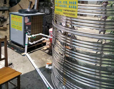 劉總到磚廠進行現(xiàn)場考察后,根據(jù)客戶的需求提供了設計方案,在原來的燃煤鍋爐的系統(tǒng)上進行改造,配置一臺5P商用空氣源熱泵熱水器,外加一個4噸的水箱。項目安裝結束后,正式進入運行階段,效果良好,很好地滿足了磚廠的熱水需求。