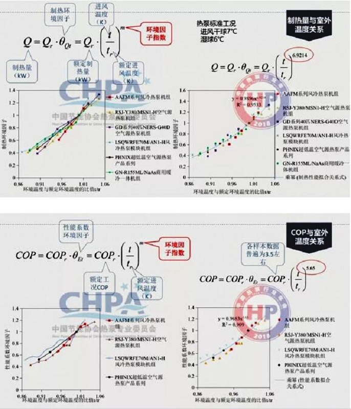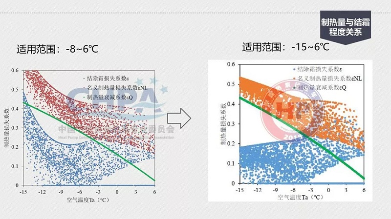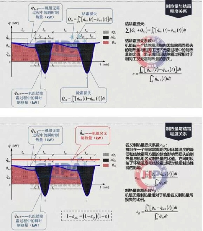 在這個(gè)因子的確定上,我們對(duì)國(guó)內(nèi)有影響的廠家生產(chǎn)的熱泵機(jī)組進(jìn)行了數(shù)學(xué)上面的處理;其環(huán)境因子的值在一般情況下,指數(shù)是5.65,建立了這個(gè)數(shù)學(xué)模型。同時(shí),對(duì)于除霜的問題,結(jié)霜是逐步的增厚,厚到一定的程度影響其換熱。為此,我們要求一定要通過除霜進(jìn)行試驗(yàn)。此時(shí),除霜是消耗其它的能量。