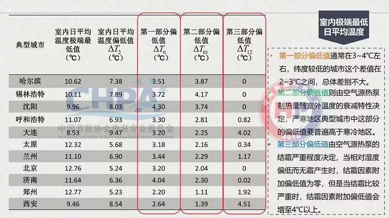 第一部分偏低值通常在3—4℃左右,緯度較低的城市這個(gè)差值在2—3℃之間,總體差別不大;第二部分偏低值則由空氣源熱泵制熱量隨室外溫度的衰減特性決定,嚴(yán)寒地區(qū)典型城市中這部分的偏低值要普遍高于寒冷地區(qū);第三部分偏低值由空氣源熱泵的結(jié)霜嚴(yán)重程度決定,當(dāng)相對(duì)濕度偏低而無霜產(chǎn)生時(shí),結(jié)霜因素附加偏低值為零,但是當(dāng)結(jié)霜比較嚴(yán)重時(shí),結(jié)霜因素附加偏低值會(huì)增至4℃以上。