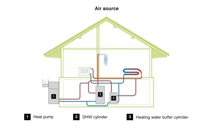 1. Heat pump(熱泵) 、2. DHW cylinder( Domestic Hot Water cylinder——生活熱水存儲(chǔ)罐)、3. Heating water buffer cylinder(供暖熱水緩沖存儲(chǔ)罐)