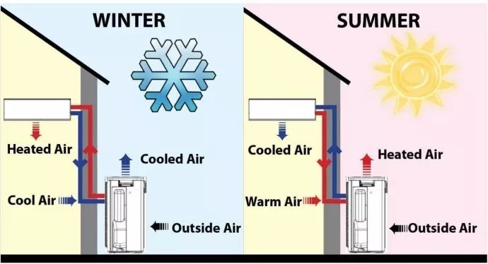 獨(dú)立住宅,空氣源熱泵,冬天(WINTER)和夏天(SUMMER),室外空氣(Outside Air)、冷空氣(Cooled Air)、熱空氣(Warm Air)的運(yùn)作,示意圖。