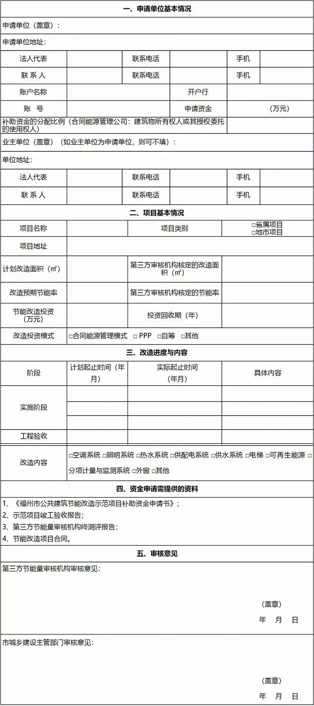 第五條 示范項目通過驗收和節(jié)能量終測評后,申報單位應持《福州市公共建筑節(jié)能改造示范項目補助資金申請書》(附件)、項目竣工驗收報告、節(jié)能量核定報告和相關工程合同等資料向市建委申請補助資金。