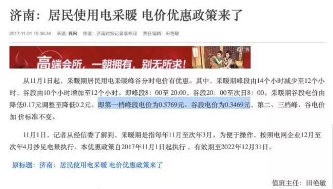 按照山東省政府文件,濟(jì)南“一戶一表居民電代煤用戶,采暖季(11月至次年3月)用電按居民階梯電價第一檔電價標(biāo)準(zhǔn)執(zhí)行”。再疊加“采暖期峰段12個小時,谷段12個小時。即峰段8:00至20:00,谷段20:00至次日8:00。采暖期第一檔峰段電價為0.5769元、谷段電價為0.3469元”。