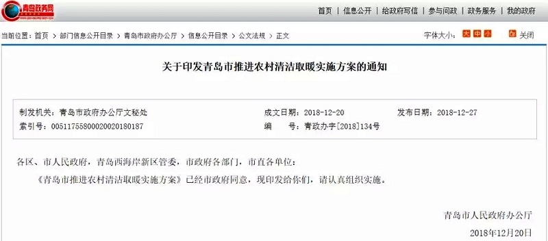 關于印發(fā)青島市推進農村清潔取暖實施方案的通知