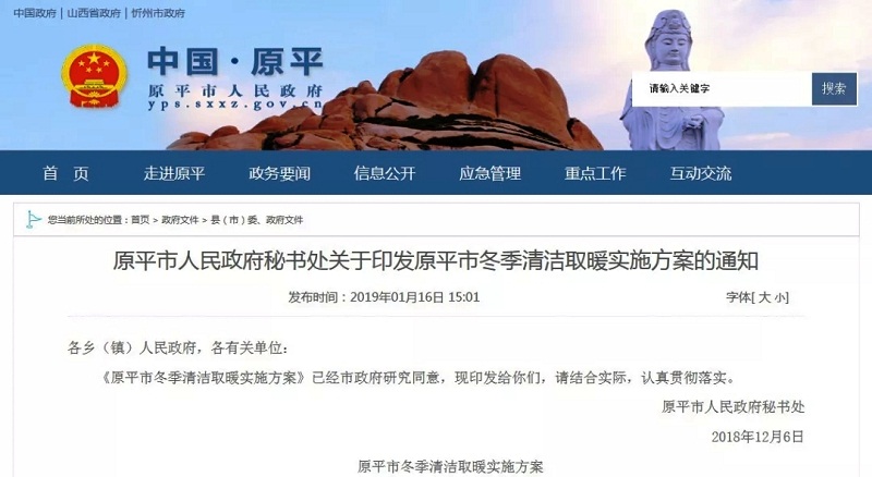 原平市人民政府因地制宜推廣空氣源熱泵電鍋爐天然氣等供暖設(shè)施,盡可能利用清潔能源實(shí)現(xiàn)清潔取暖