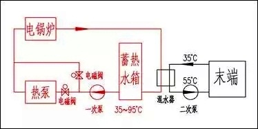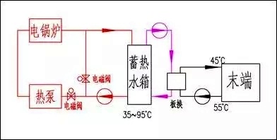 在晚間谷電價(jià)的時(shí)間段中,空氣源熱泵機(jī)組把蓄熱水箱的水溫從35℃提升到50℃,電鍋爐再把水溫提升到95℃。