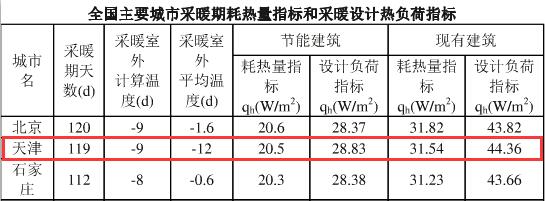 根據《全國主要城市采暖期耗熱量指標和采暖設計熱負荷指標》,天津地區(qū)非節(jié)能建筑每平方米采暖季供暖所需熱量為44.36w/㎡*24h*119d/1000≈126.69kwh/㎡